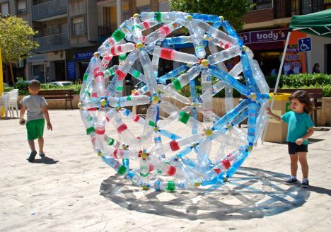 Con motivo de la celebración de la Fira del Medi Ambient de Mislata construimos diversas esferas y cúpulas 2V a partir de botellas de 1,5 litros.