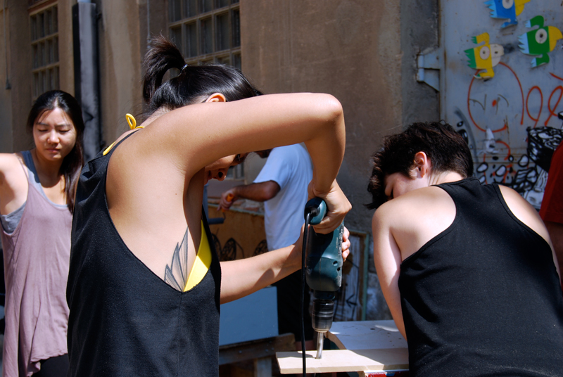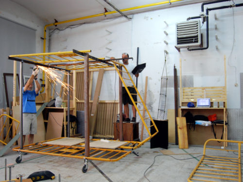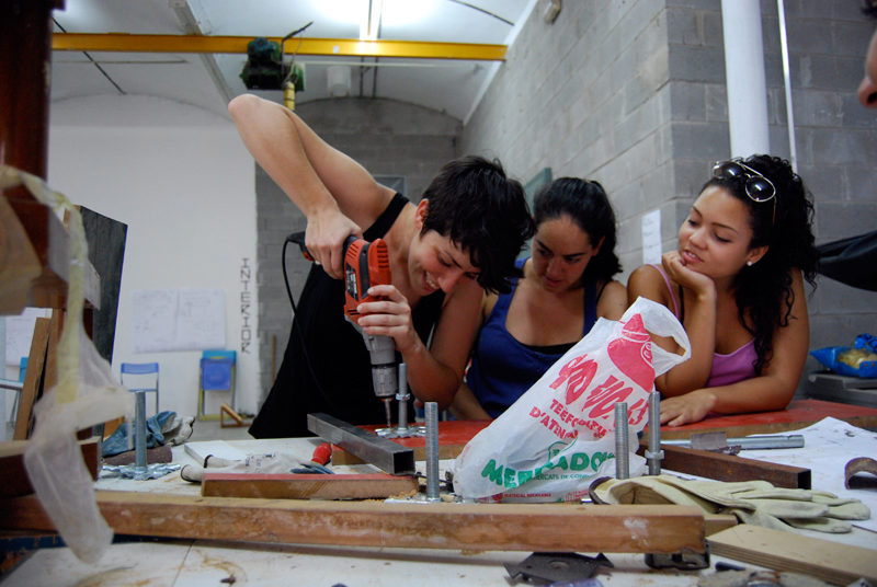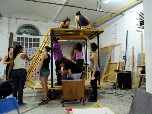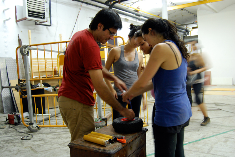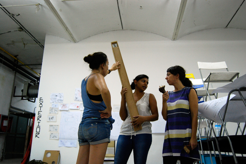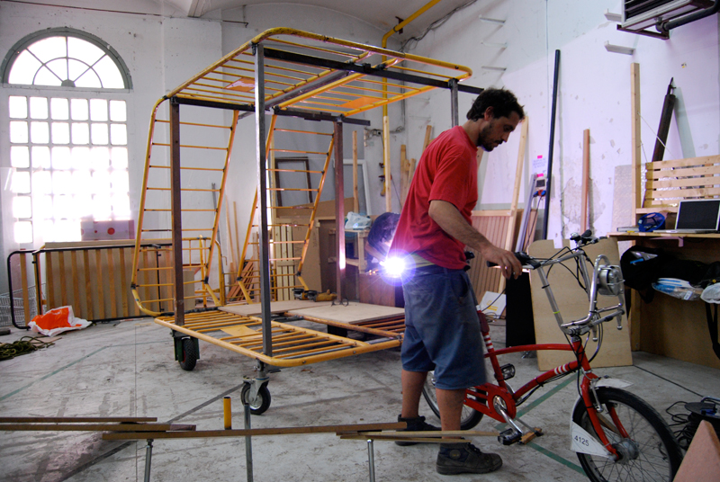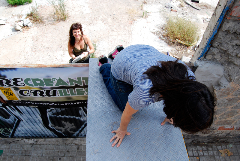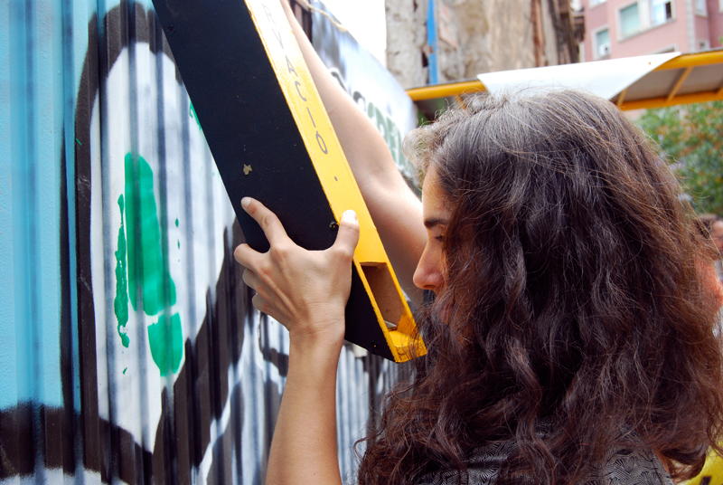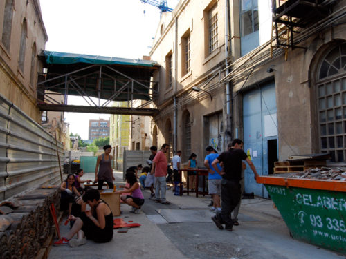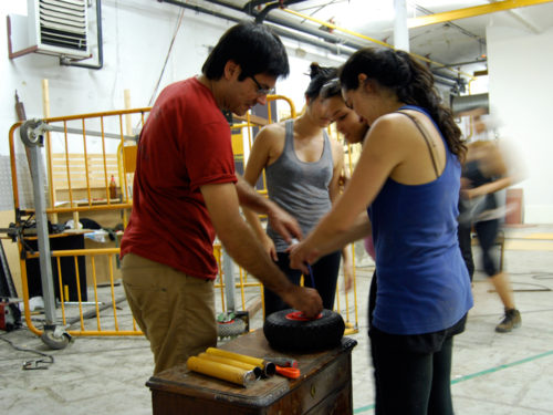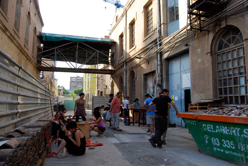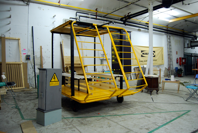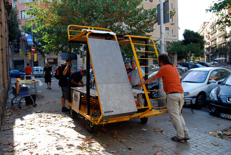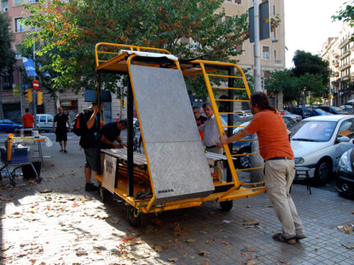 Una vez marcados los objetivos, nos ponemos a la búsqueda de material para la construcción de los elementos para la intervención. Tras varias derivas por el barrio del Eixample, la colaboración de la Carpintería Poblenou que nos deja abastecernos de los restos de obra de su container y el taller La Fundició del Poblenou que nos cede restos de piezas, nos hacemos con un buen montón de material para comenzar. Listones, restos de chapas antideslizantes, vallas, diferentes tipos de ruedas, piezas de montaje de escenarios, una escalera de caracol, espejos de muebles antiguos, aglomerados y DM’s variados… son los ingredientes con los que contamos para esta ocasión.