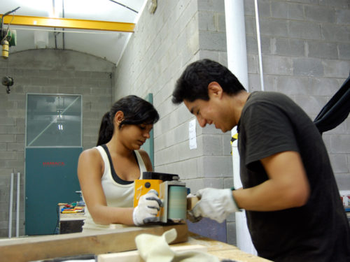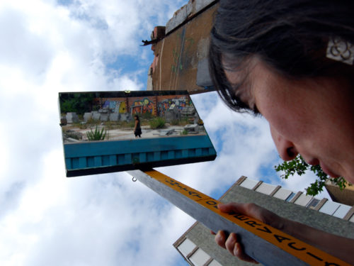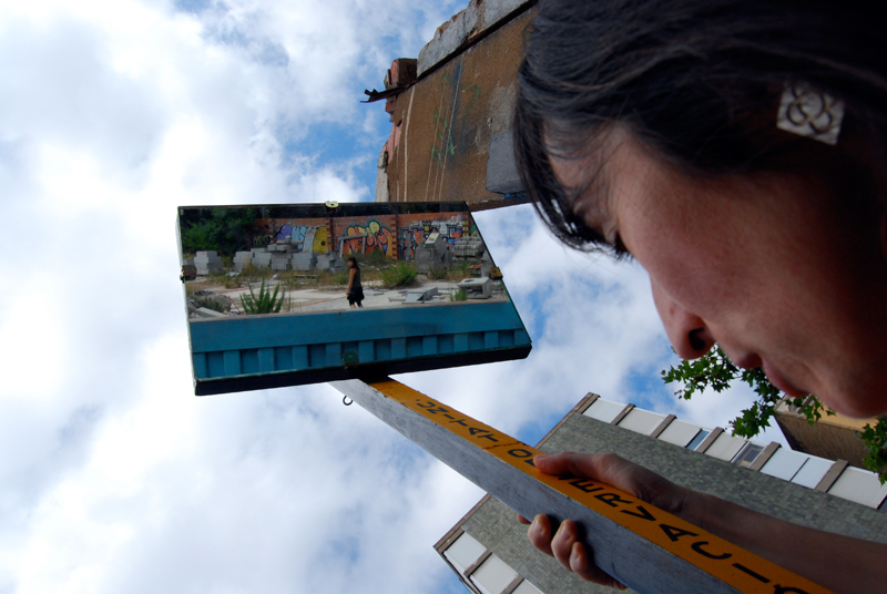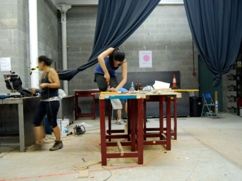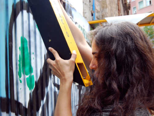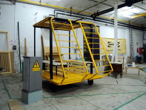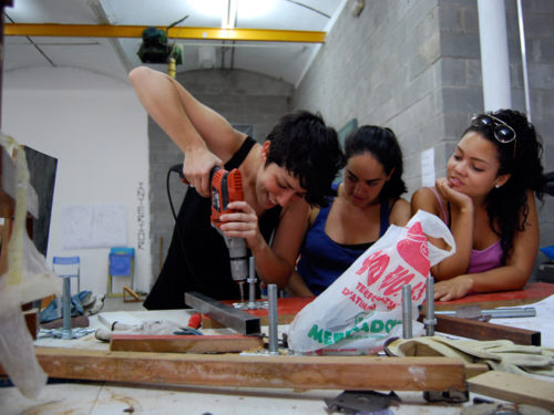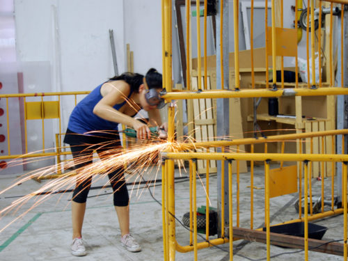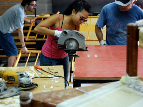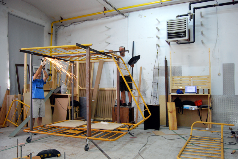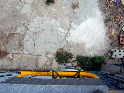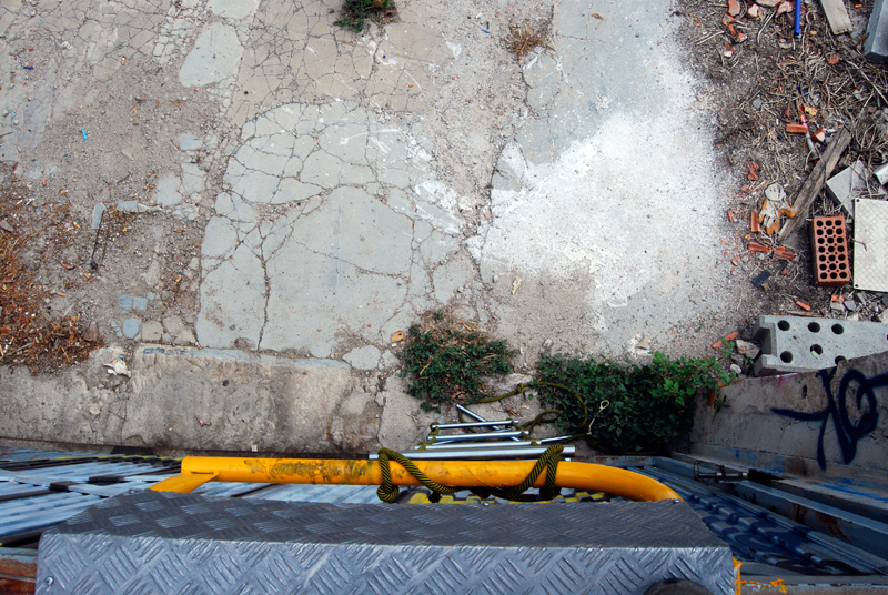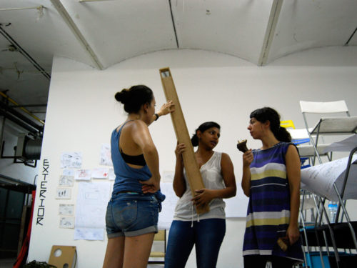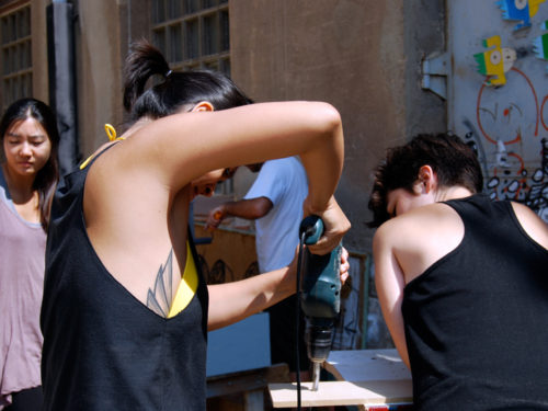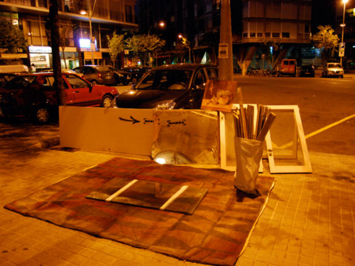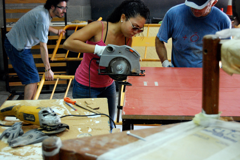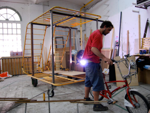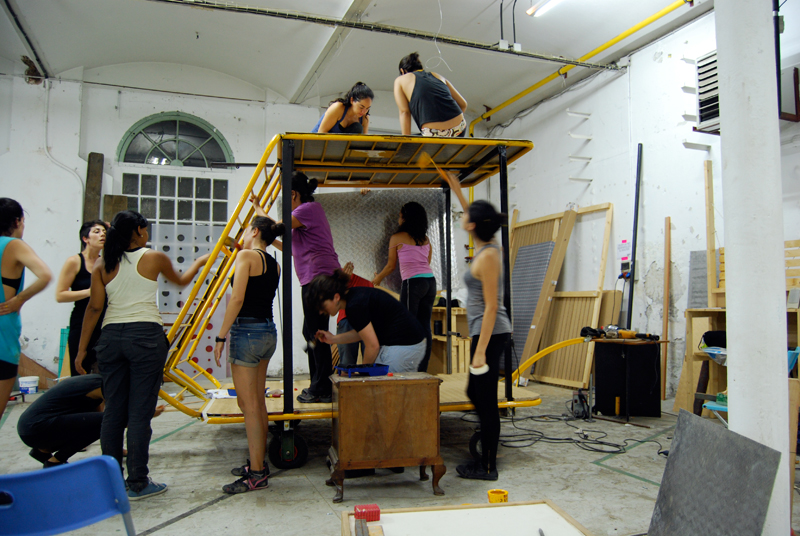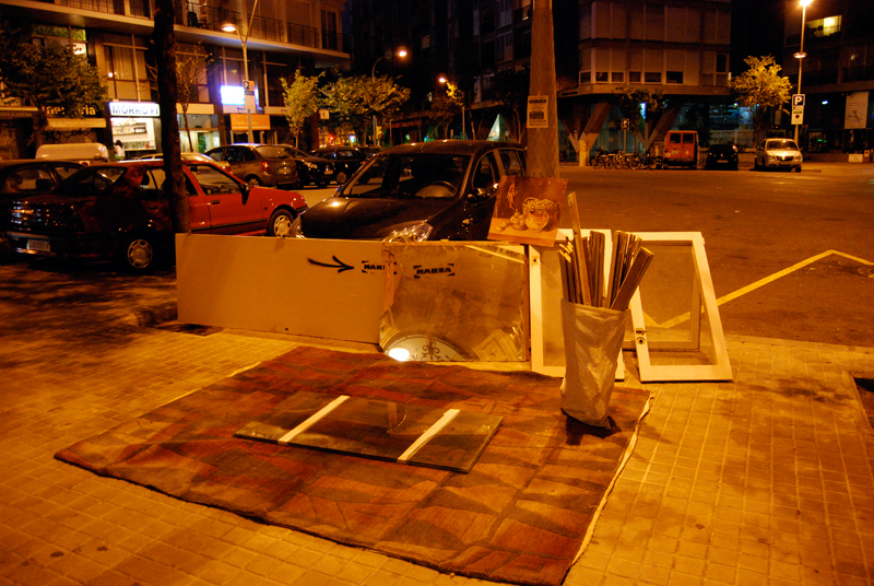 Una vez marcados los objetivos, nos ponemos a la búsqueda de material para la construcción de los elementos para la intervención. Tras varias derivas por el barrio del Eixample, la colaboración de la Carpintería Poblenou que nos deja abastecernos de los restos de obra de su container y el taller La Fundició del Poblenou que nos cede restos de piezas, nos hacemos con un buen montón de material para comenzar. Listones, restos de chapas antideslizantes, vallas, diferentes tipos de ruedas, piezas de montaje de escenarios, una escalera de caracol, espejos de muebles antiguos, aglomerados y DM’s variados… son los ingredientes con los que contamos para esta ocasión.