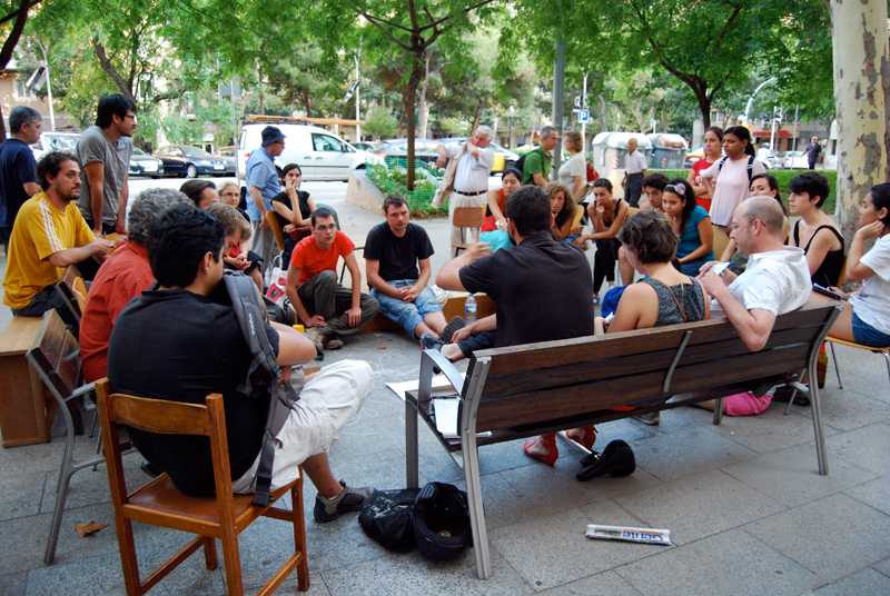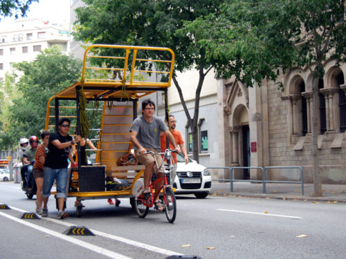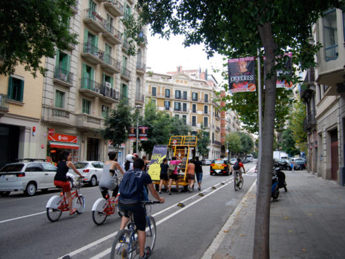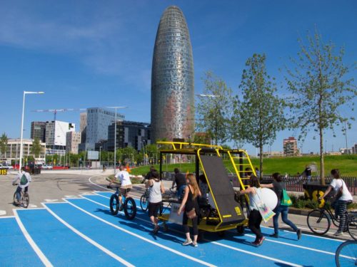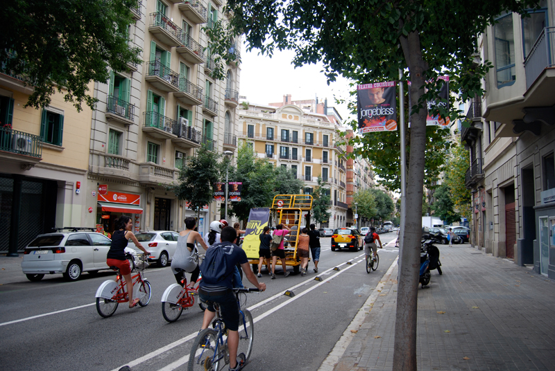 Con todo nuestros planes y artilugios, nos ponemos en marcha dirección al Solar de Germanetes, y así comenzamos el recorrido y visibilización de la unidad móvil OBNI por Barcelona. Le enganchamos la bicicleta y salimos de las instalaciones de Hangar, cogimos Diagonal Mar hasta la Plaza de Glòries, subimos por la Diagonal hasta el carrer Diputació, se recorrió casi toda la calle haciendo varias paradas, cruzamos Passeig de Gràcia y ya encaramos la recta final hasta el carrer Comte Borrell, donde llegamos al cruce de calles entre Comte Borrell y Consell de Cent e instalamos el dispositivo. Y allí estaban los vecin@s, que habían preparado una comida popular, para descubrir la nueva herramienta que habíamos generado y que poníamos a su disposición, al que al verlo, un grupo de ellos bautizó como Germanòdrom.