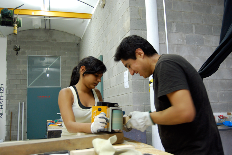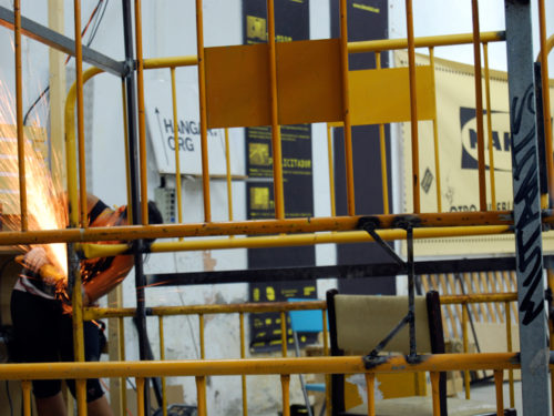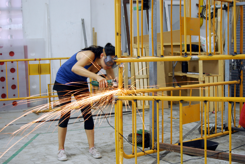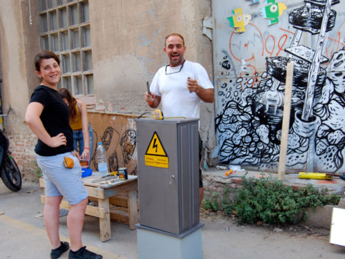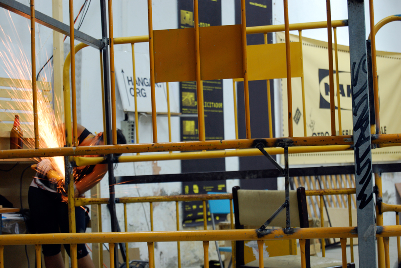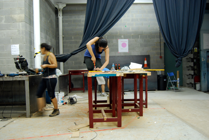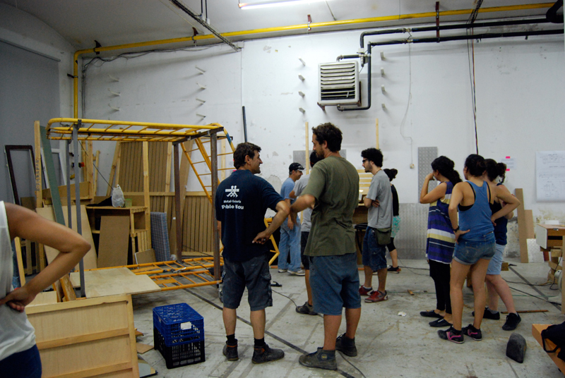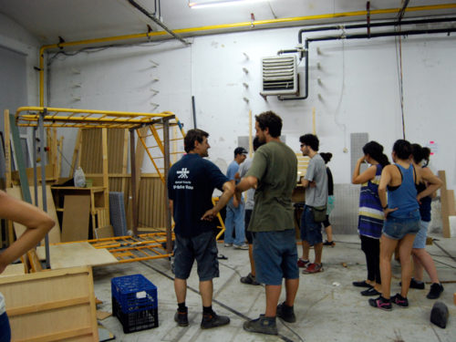 Con todo el material, comenzamos a realizar varias sesiones de cómo relacionar las necesidades marcadas por el grupo de vecin@s, el tiempo del que disponíamos y las capacidades de transformación. Durante la semana, las jornadas de trabajo se alargaron hasta bien entrada la noche, el tiempo se pasó entre debates de cómo y por dónde se podía acceder, bocetando, cortando, pintando, ensamblando… y de cómo podíamos crear un artefacto de ocupación de espacios en desuso construido a partir de residuos, y que funcionara como activador de intervenciones temporales en el espacio público.